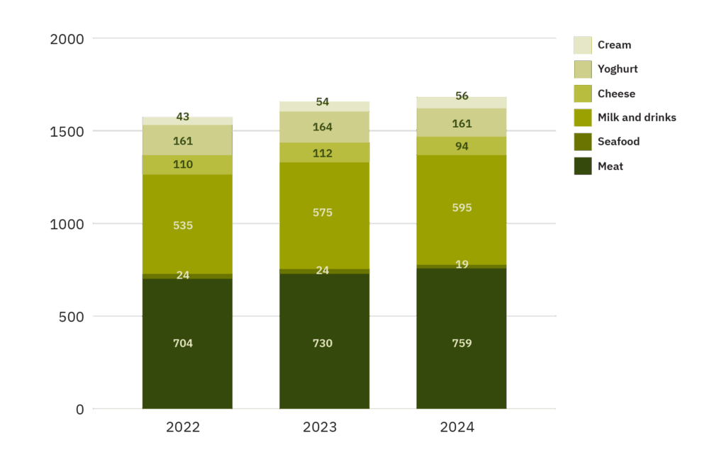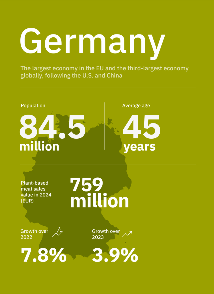 - Germany stands as Europe’s largest plant-based market, valued at €1.7 billion in 2024. Out of this, plant-based meat sales recorded a sales value of EUR 759 million, largely fuelled by private-label offerings and robust retail integration.