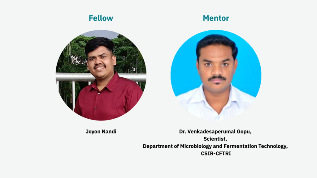 Joyon Nandi, a second-year M.Sc. Food Technology student from CSIR-CFTRI, will be undertaking a research project at the interface of fermentation-derived and plant-based smart protein, under the mentorship of Dr. Venkadesaperumal Gopu. His project will explore the development and application of Bacillus-derived poly-γ-glutamic acid as a smart protein biopolymer for functional enhancement of plant-based yoghurt. This research aims to develop a fermentation-derived solution for functional and nutritional enhancement of plant-based dairy systems, promising improved texture, gut health benefits, and environmental sustainability. By leveraging the versatility of fermentation technology for the production of poly-γ-glutamic acid, this research may offer the opportunity to create tasty and nutritious plant-based yoghurt for consumers. With strong scalability potential, the outcomes of this project can catalyse the transition toward a resilient and sustainable food system in the country.